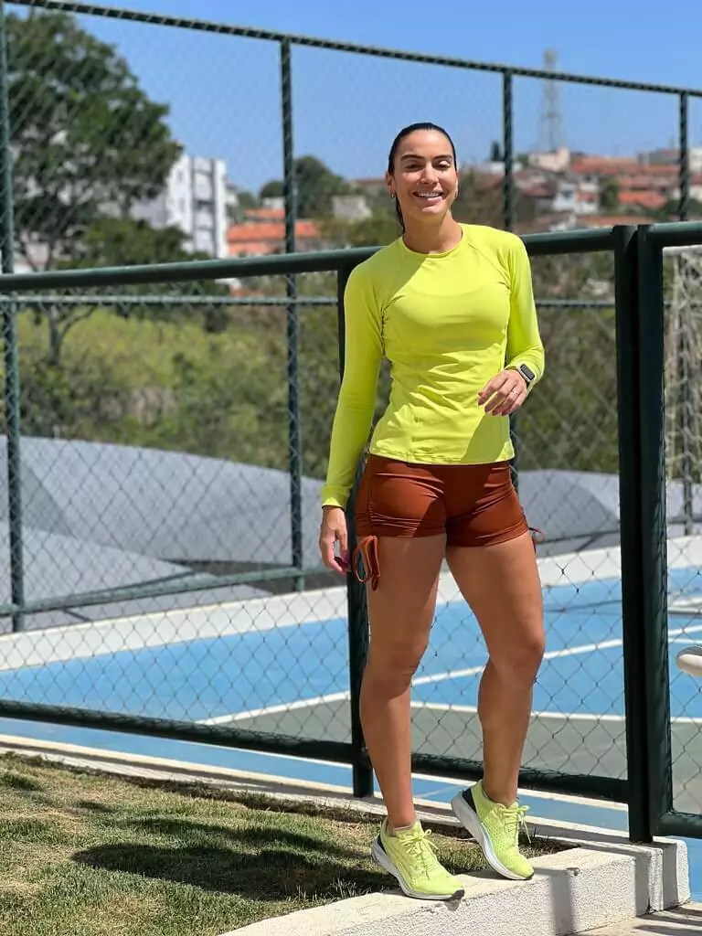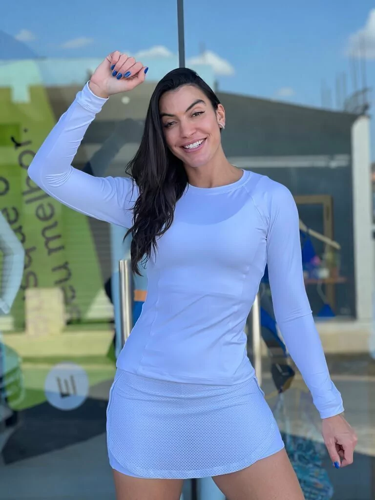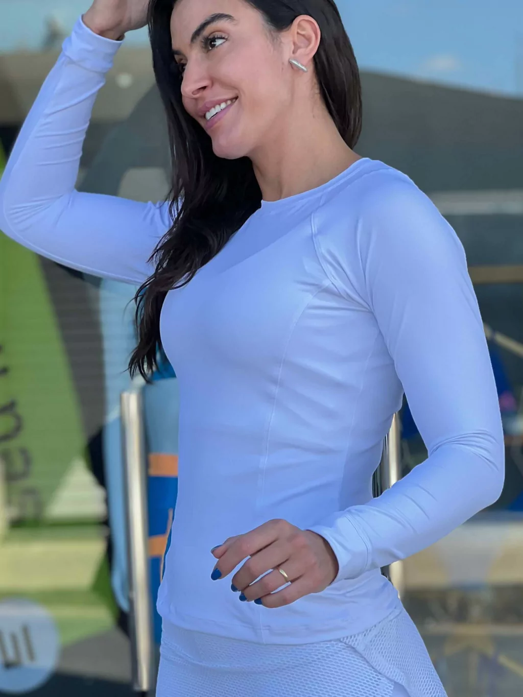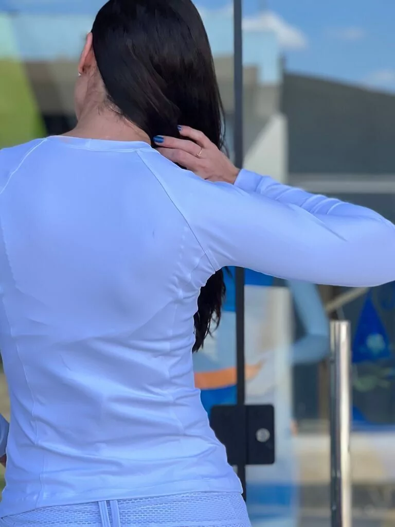Confeccionada em tecido de poliamida de toque suave, a peça ainda oferece proteção UV, sendo ideal para práticas esportivas ao ar livre ou em ambientes de alta exposição solar.