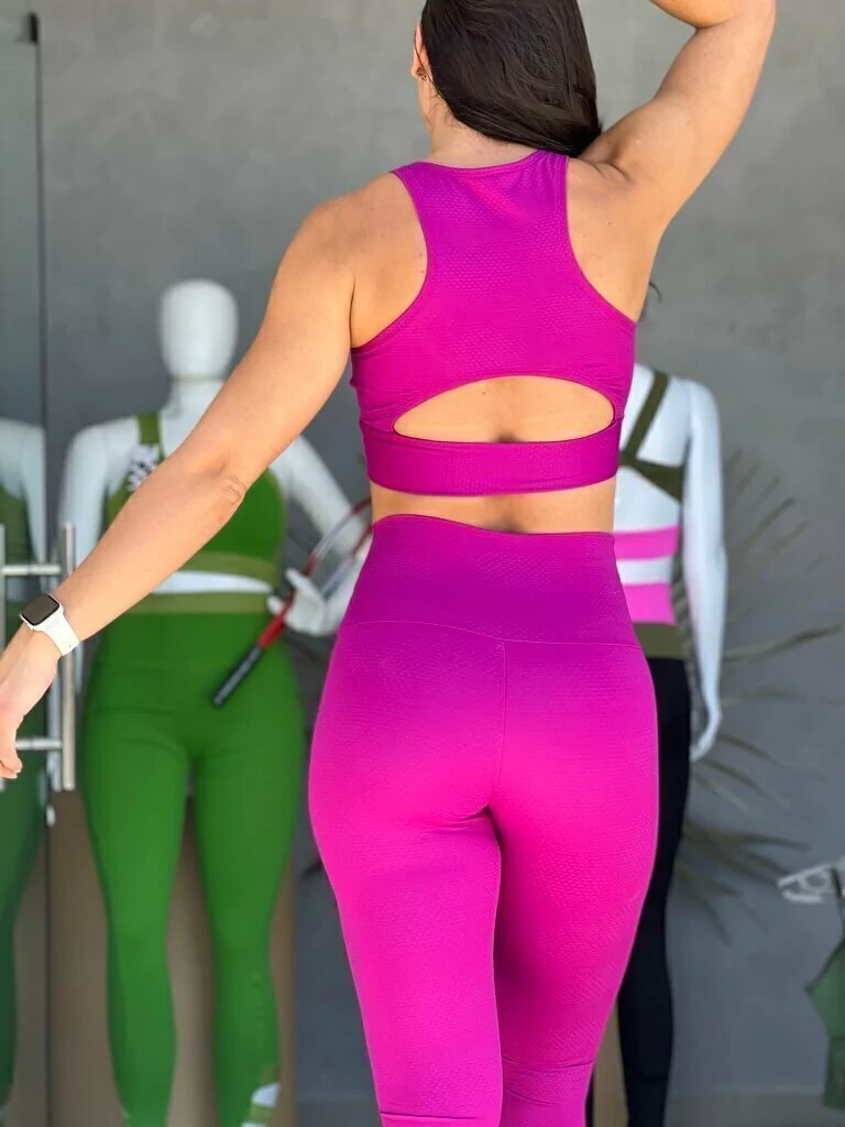 Este conjunto de academia inclui um top com decote nadador nas costas e decote V na frente, oferecendo um visual esportivo e feminino.
