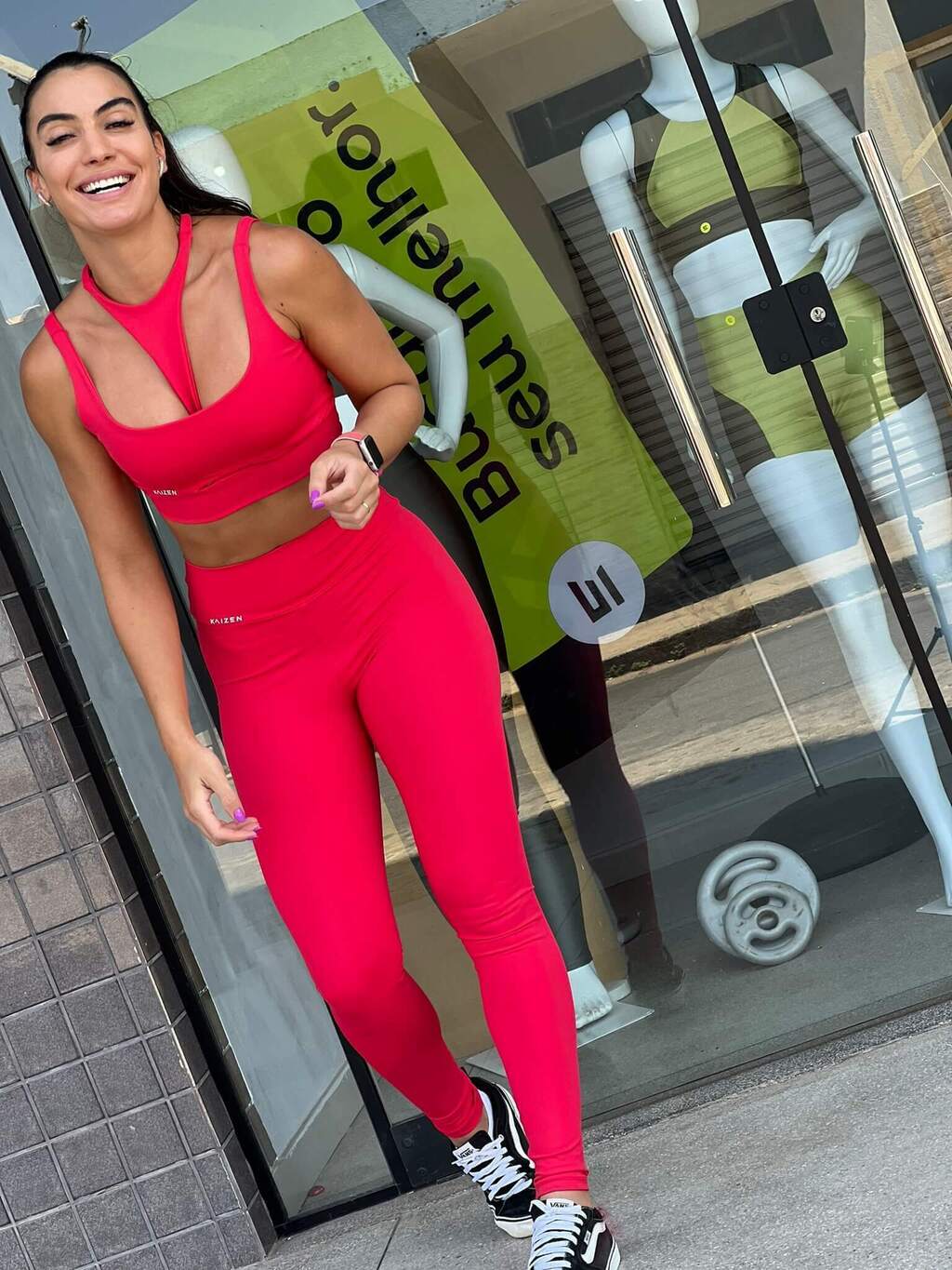 A legging, feita no mesmo tecido, tem modelagem minimalista com cós alto, oferecendo compressão firme e controlada. Seu toque é macio e confortável.