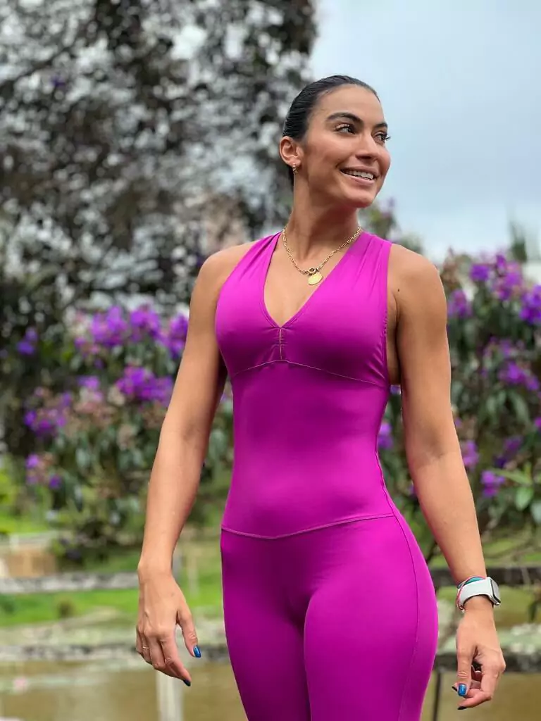 O busto apresenta recortes anatômicos e decote em V, com entrada para bojo, proporcionando sustentação, feminilidade e firmeza durante os treinos.