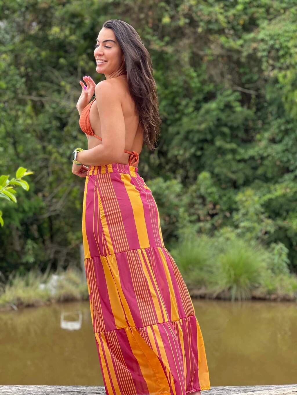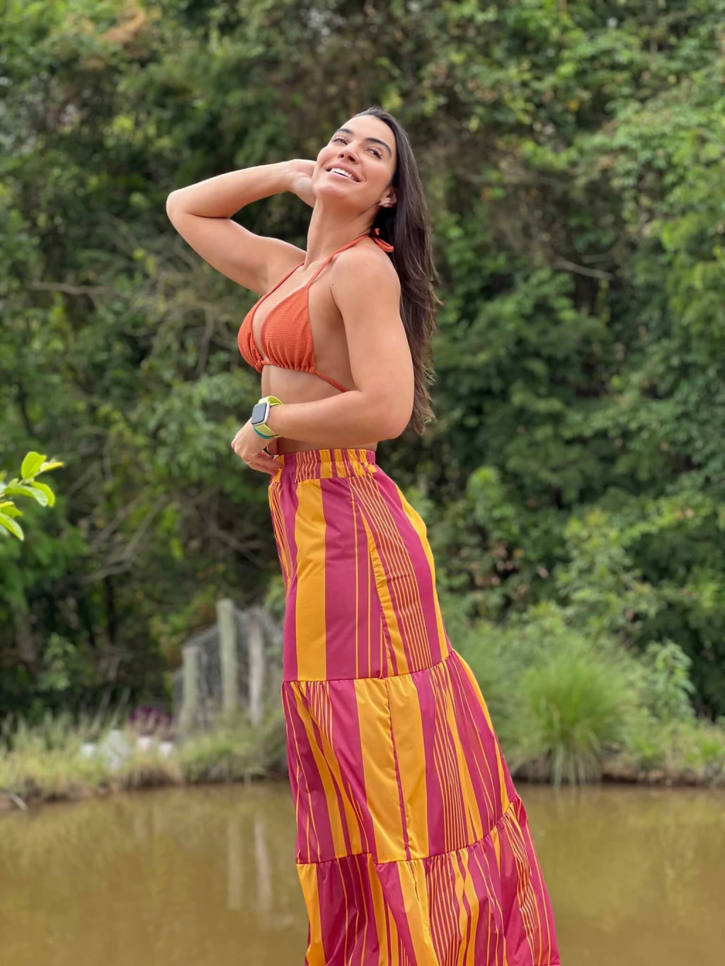 A saia longa essencial para compor produções frescas e elegantes no verão. Confeccionada em tecido leve, com transparência e de secagem rápida, oferece fluidez e conforto nos dias mais quentes.